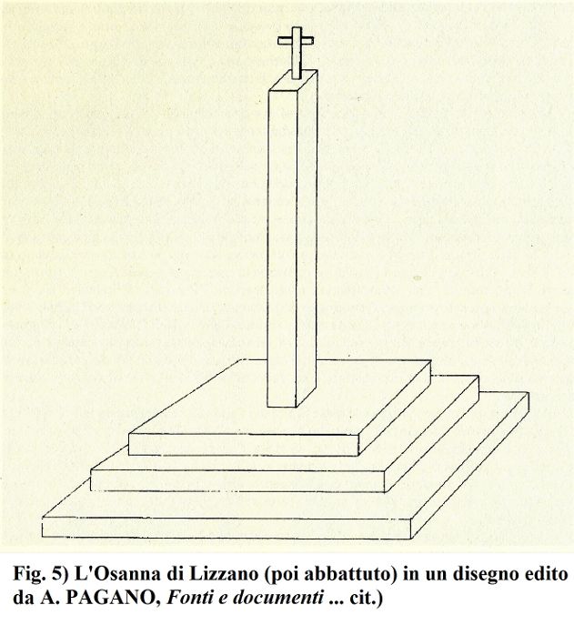 Un Osanna, poi abbattuto, è indicato a Lizzano, “su Largo Aia, in seguito piazza XX Settembre ed attuale Piazza Matteotti … I fratelli delle congreghe laicali, la domenica delle Palme rendevano omaggio al monumento sacro portando i rami di ulivo benedetti. L’Osanna fu abbattuto nel 1929-30 per consentire la costruzione dell’edificio scolastico” (da A. PAGANO, Fonti e documenti per la storia delle chiese e del convento di Lizzano, Lecce, Del Grifo, 1996) (fig. 5).
