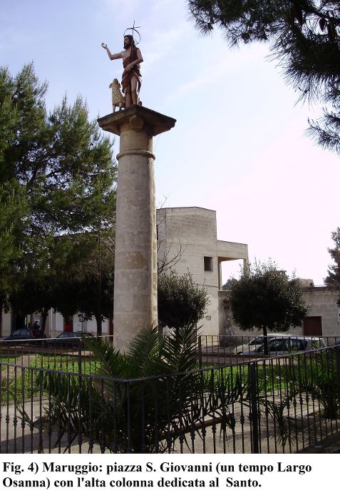 Il toponimo Osanna compare, nel comune di Maruggio, a caratterizzare la piazza di S. Giovanni, all’esterno dell’antica Terra Murata; piazza prospiciente la chiesetta medievale omonima, oggi dimessa, attribuita ai cavalieri di San Giovanni di Gerusalemme (detti, poi, di Malta), ricovero, un tempo, di pellegrini ed ammalati, per l’annesso ospedale, poi distrutto. Luogo di incrocio viario, anche questo, con arterie dirette al mare, e verso i paesi dell’interno (Manduria ed Avetrana); luogo immediatamente extra moenia, a breve distanza dalla porta piccola aperta nelle mura orientali della Maruggio medievale. E la colonna eretta al centro dell’attuale piazza, con la statua di S. Giovanni sovrastante, richiama la presenza dell’ Osanna (testimoniato dall’antica denominazione di Largo Osanna, poi Piazza dell’Aja, attribuita al posto) e la secolare devozione per il Santo, così caro ai Cavalieri di Malta, a lungo signori di questa Terra (cfr. C. DEMITRI, Le tradizioni popolari di Maruggio, Martina Franca, Ed. Pugliesi, 2005, pp. 38-39) (fig. 4).