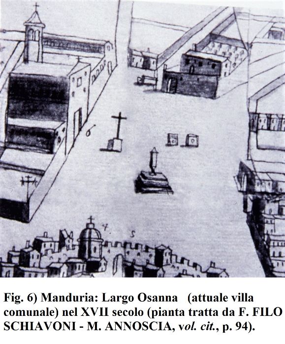 Un Osanna è riportato, in una pianta del Seicento, a Manduria, abbattuto poi, nel 1882, per la realizzazione dei giardini pubblici; e qui insiste il toponimo “Largo Osanna” all’incrocio di arterie provenienti da Avetrana, S. Pietro in Bevagna, Maruggio ed Uggiano Montefusco, in corrispondenza dell’antica porta del mare, inglobata nelle mura medievali (vedi F. FILO SCHIAVONI - M. ANNOSCIA, … tra i segni di tanta vita e di tanta storia. Manduria in immagini e documenti fra ‘800 e ‘900, Manduria, ed. TM, 1994, pp. 93-94) (fig. 6).
