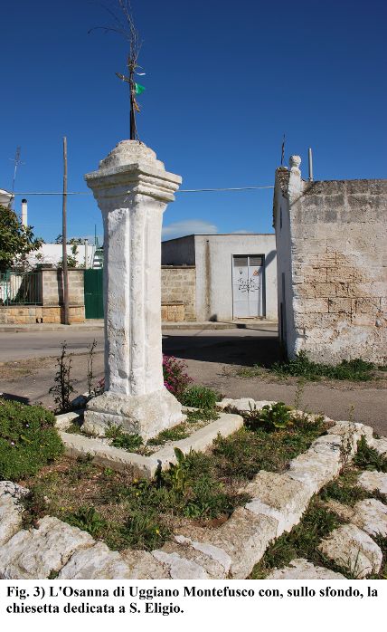 Un altro Osanna caratterizza la periferia orientale di Uggiano Montefusco (frazione di Manduria) a ridosso della chiesetta di S. Eligio; assume la forma di un alto pilastrino (dai bordi sagomati), impostato su larga pedana di base, con capitello in cima sormontato da croce in ferro e ramo d’olivo benedetto; si colloca anch’esso su un incrocio di vecchie strade, oggi asfaltate, dirette verso il mare ed il territorio rurale di Bagnolo. Nei pressi si svolgeva l’antica fiera del bestiame: luogo di fede e commercio, quindi, immediatamente all’esterno del borgo antico, in parte risparmiato dai recenti sviluppi urbanistici (G. BECCI, Il centro storico di Uggiano Montefusco. Manduria 1994, pp. 52-67) (fig. 3).