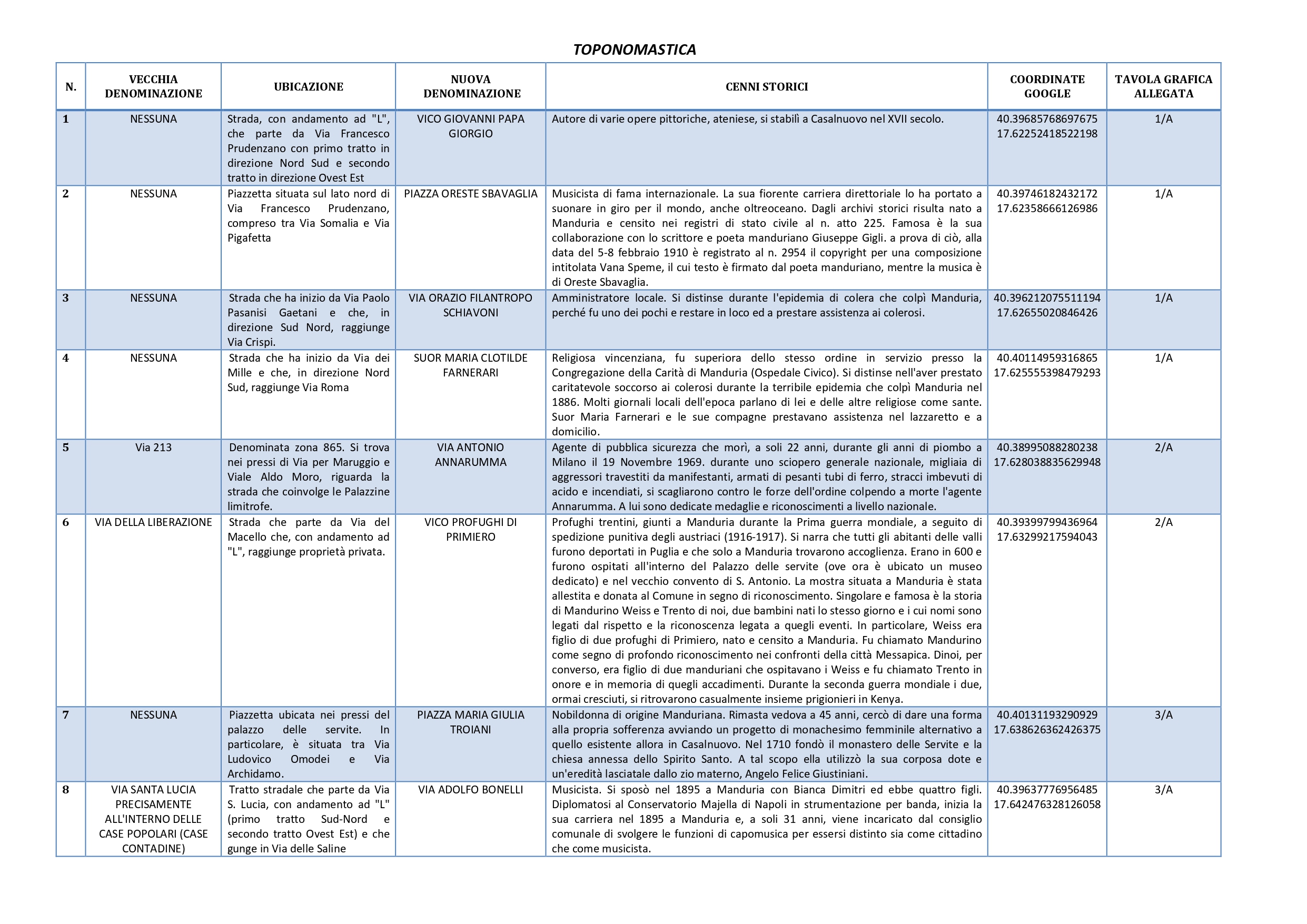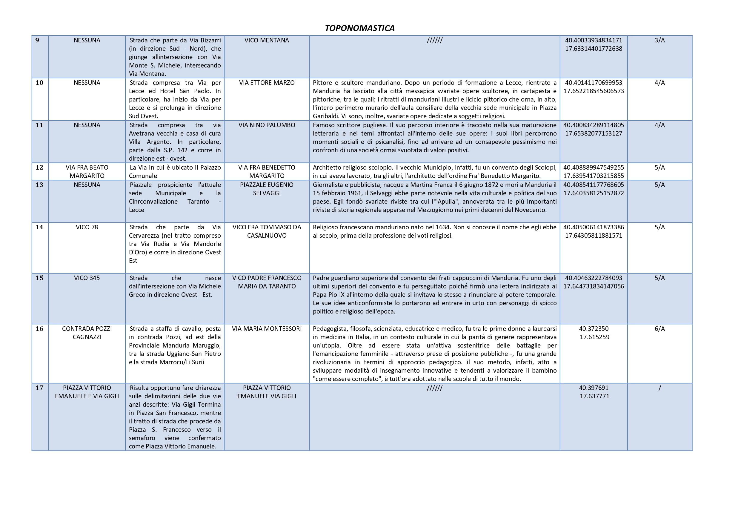 Dopo alcuni decenni di inattività nel settore della toponomastica (l'ultima denominazione di una via risale al 2006), alla Commissione è stato affidato il compito di scegliere dei personaggi per denominare le vie di Manduria che non presentavano alcuna intitolazione o che, diversamente, si limitavano in passato ad essere indicate con una mera segnalazione numerica.