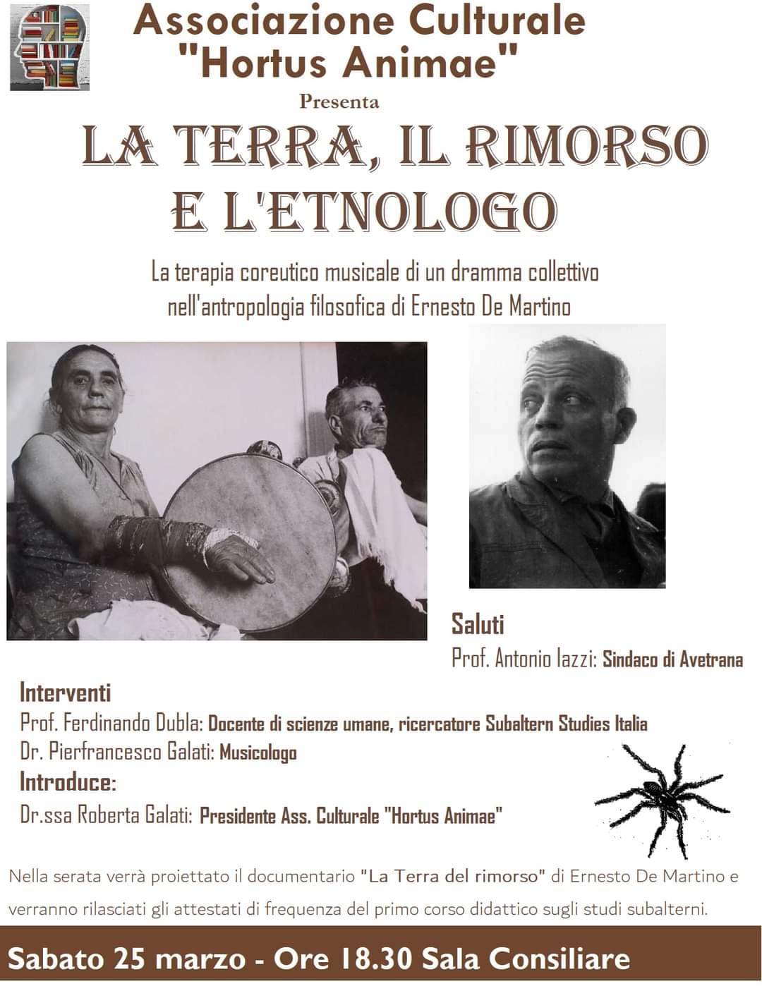 Sabato 25 marzo, nella sala consiliare del Comune di Avetrana, l’associazione culturale Hortus Animae affronterà il tema del “tarantismo”, un istituto culturale d’impronta magica, diffuso nelle comunità contadine del Salento, al cui interno la musica e la danza ricoprono un ruolo d’importanza primaria e a cui l’opera dell’antropologo Ernesto De Martino “La terra del rimorso” ha dato un notevole contributo di analisi e conoscenza.