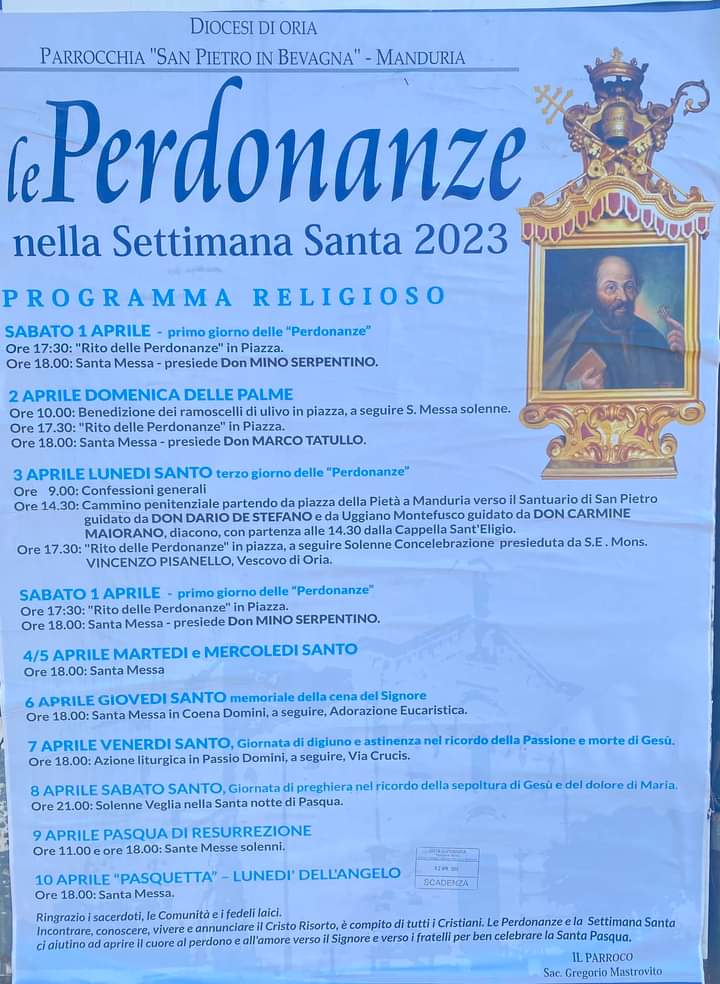 Ore 14,30: cammino penitenziale partendo da piazza della Pietà a Manduria verso il santuario di San Pietro, guidato da don Dario De Stefano, e da Uggiano Montefusco, guidato da don Carmine Maiorano, diacono, con partenza alle ore 14,30 dalla cappella di Sant’Egidio.
