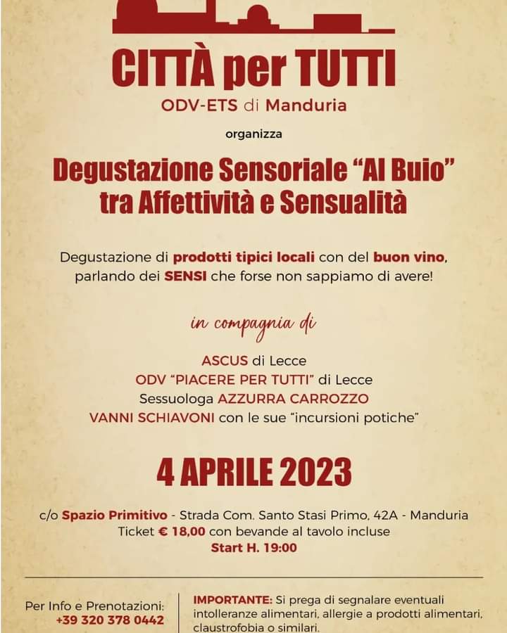 L’associazione Città per Tutti propone, per il 4 aprile, una degustazione sensoriale “al buio” tra affettività e sensualità.