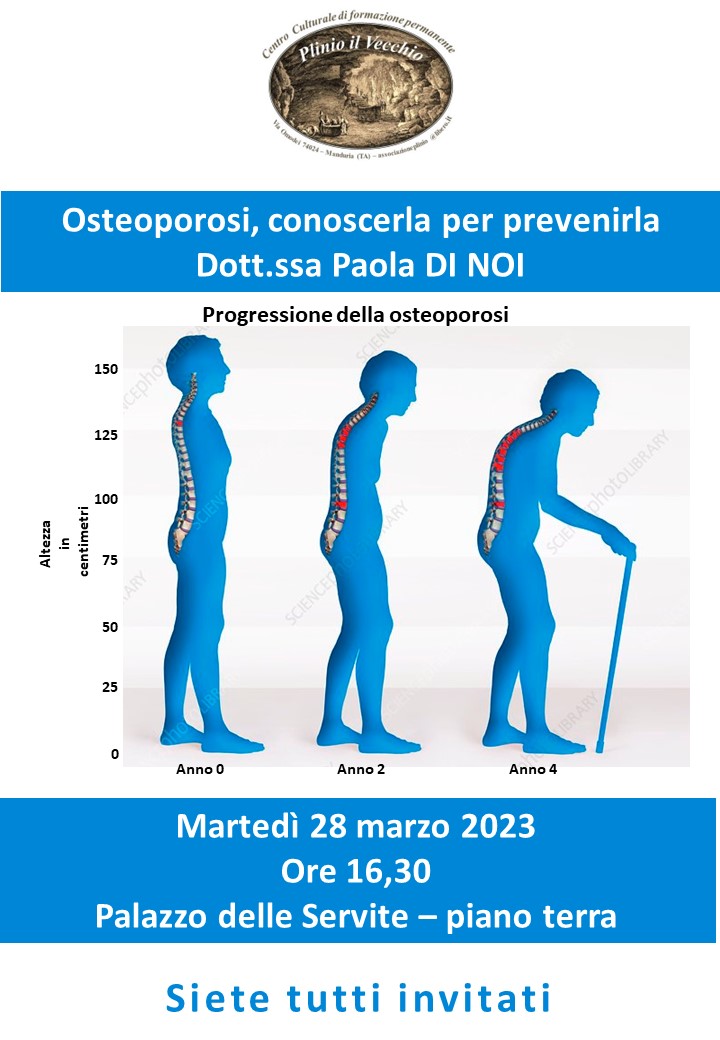 Domani (martedì), alle ore 16,30, presso il palazzo delle Servite, è in programma la relazione della dott.ssa Paola Dinoi sul tema: “Osteoporosi, conoscerla per prevenirla”.