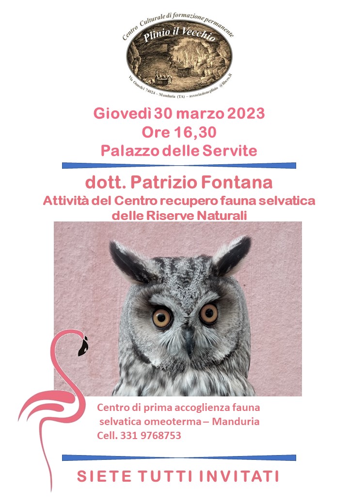 Giovedì 30 marzo, sempre alle ore 16,30, sempre al palazzo delle Servite, il dott. Patrizio Fontana illustrerà ai presenti le attività del Centro di Recupero della Fauna Selvatica delle Riserve Naturali.