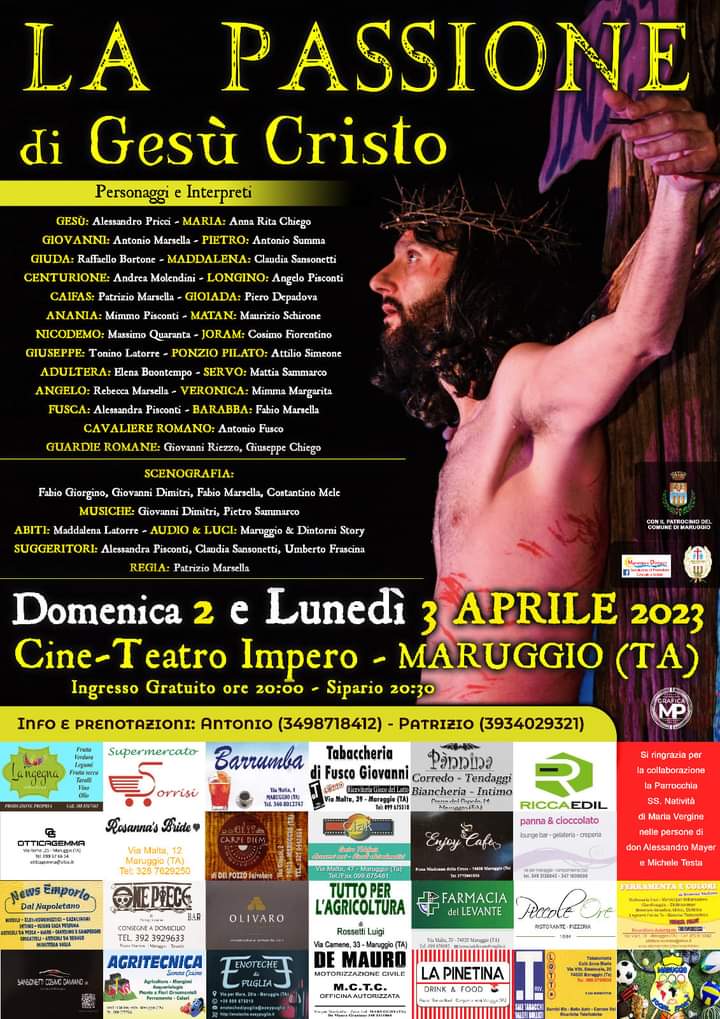 Domenica 2 e lunedì 3 aprile verrà rappresentata, presso il cine teatro Impero di Maruggio, la Passione di Gesù Cristo.