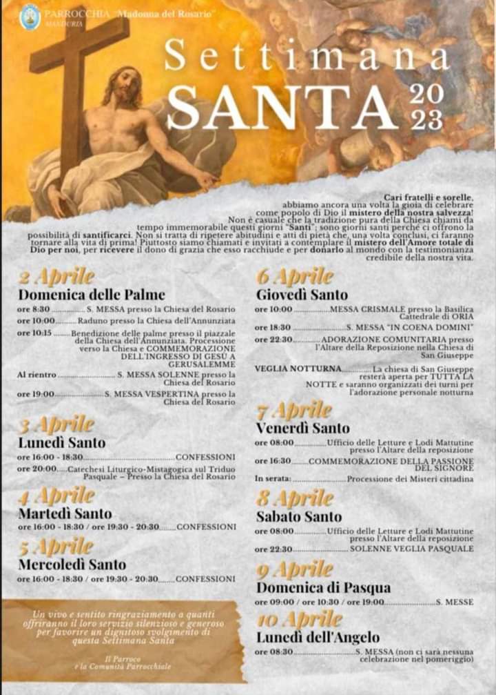 Ecco programma dei riti per la Settimana Santa della parrocchia del Rosario: