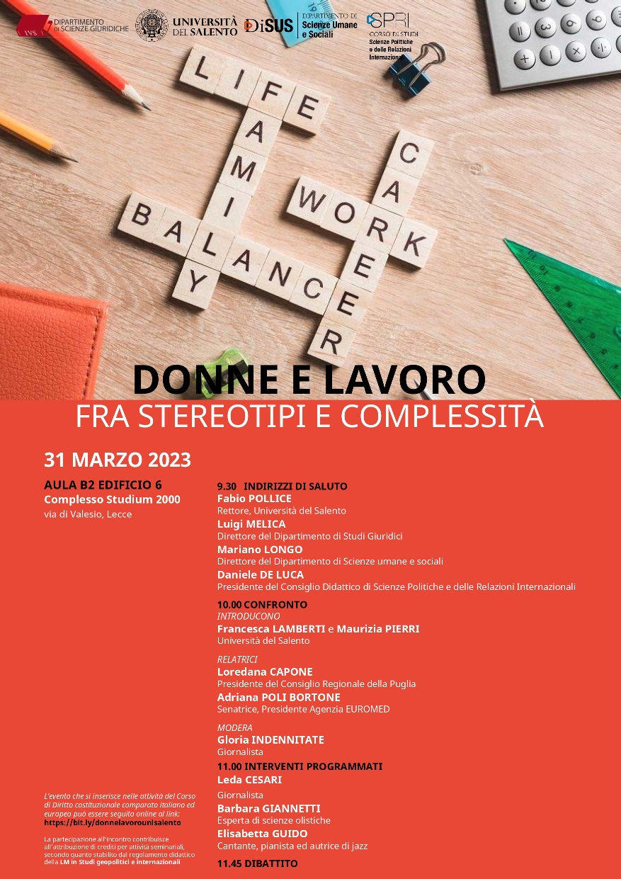 «L’evento si propone di esplorare il rapporto tra le donne e il mondo del lavoro», spiegano le organizzatrici, «con le insidie legate, da un lato, alla perdurante esistenza di stereotipi (la carrierista, la meretrice, la virago, l’isterica, l’incapace, la ‘zitella’, la ‘madre snaturata’), dall’altro alla difficoltà di conciliare gli impegni professionali con quelli familiari e di “cura”. Le relatrici principali saranno le onorevoli Loredana Capone e Adriana Poli Bortone, due donne esemplari per la capacità di occupare uno spazio in un contesto complesso e delicato come quello della scena politica».