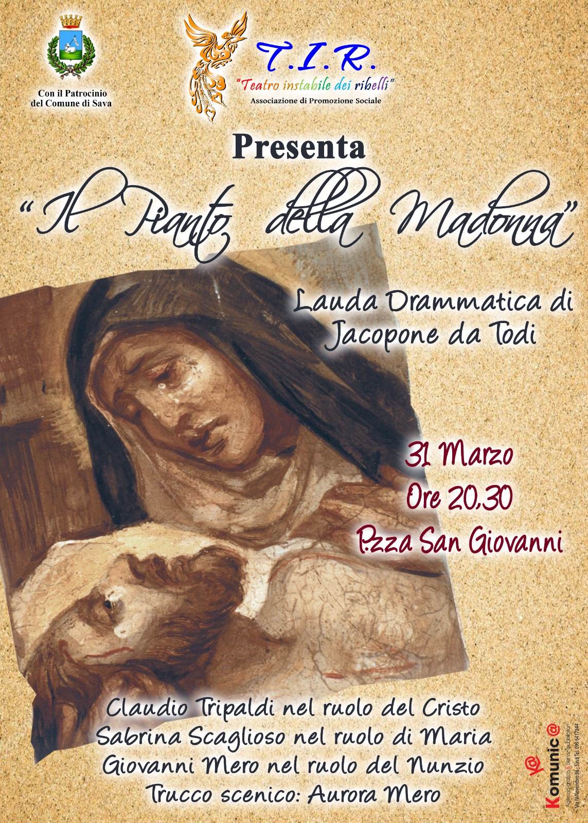 Il T.I.R. - Teatro Instabile dei Ribelli, in occasione dell'approssimarsi delle festività Pasquali, porta in scena la Lauda Sacra "Il pianto della Madonna", di Jacopone da Todi.