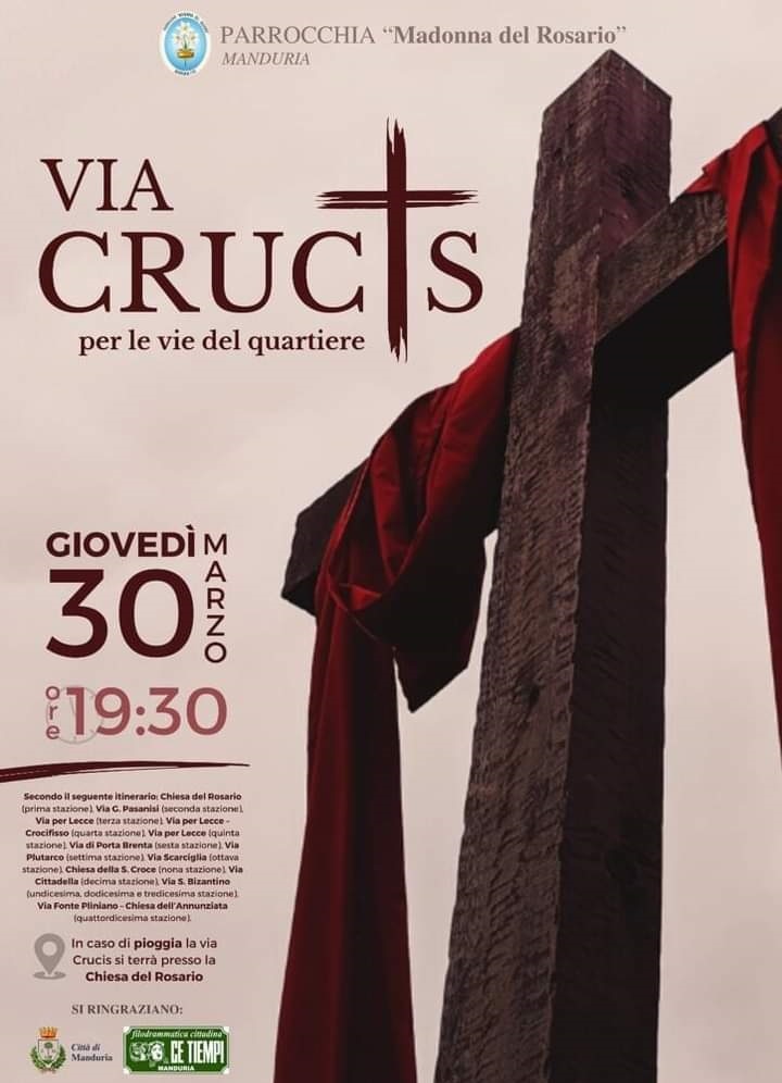 Si terrà domani sera, a partire dalle ore 19,30, la rappresentazione sacra della “Via Crucis per le vie del quartiere”, promossa dalla parrocchia della Madonna del Rosario in collaborazione con la compagnia “Cè Tiempi”.