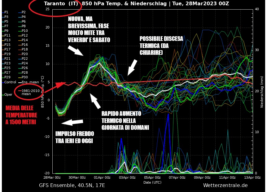 Ci attende da oggi un rapido aumento delle temperature, nuovamente sopra la media come evidenziato nel grafico in allegato, più concreto tra la giornata di domani e quella di sabato, dove potremmo raggiungere i 18/20°C grazie alla rapida espansione di aria molto mite dal Nord Africa. La ventilazione tornerà a disporsi dai quadranti meridionali, ma neanche 48 ore e la colonnina termica tornerà a scendere grazie all'intrusione di correnti artiche che, probabilmente, si faranno sentire in maniera sensibile all'inizio della prossima settimana.