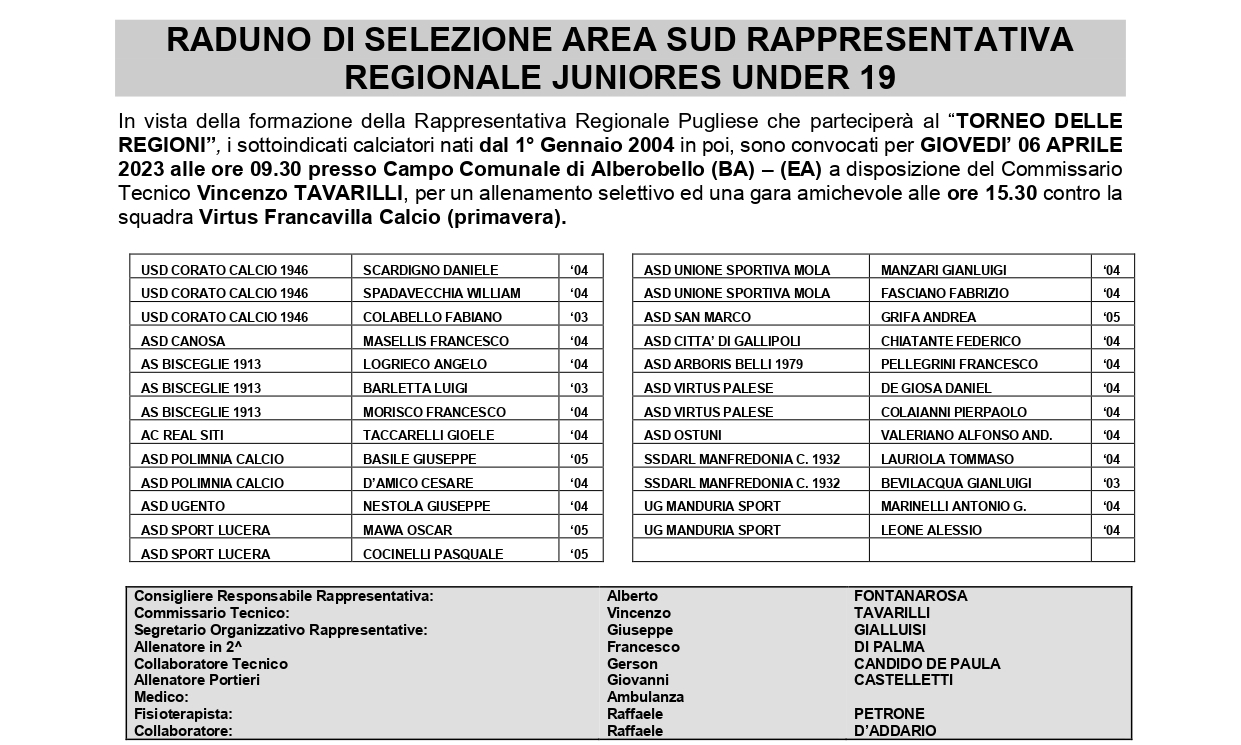 L’allenamento si svolgerà giovedì 6 aprile ad Alberobello. E’ prevista un’amichevole contro la squadra Primavera della Virtus Francavilla. Il commissario tecnico della rappresentativa pugliese è Vincenzo Tavarilli.