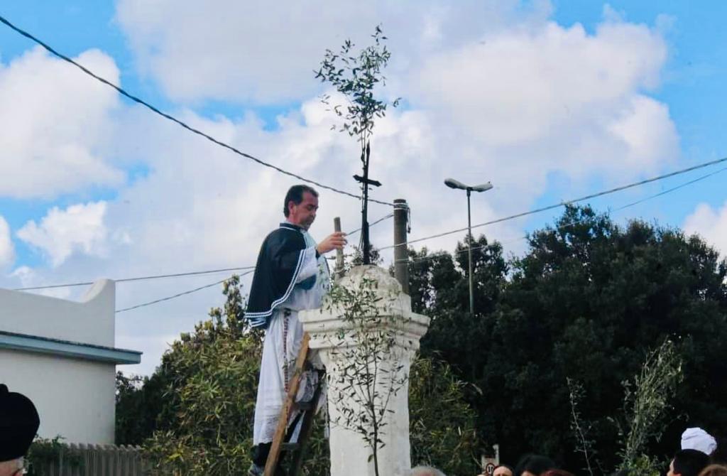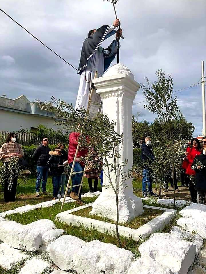 Fra le immagini che accompagnano lo scritto, la suggestiva foto di un confratello della Confraternita della Madonna del Rosario di Uggiano Montefusco (frazione di Manduria), nell’atto di issare il ramo d’ulivo benedetto sulla croce in ferro che sormonta l’Osanna, alla presenza di alcuni fedeli che assistono raccolti in preghiera.