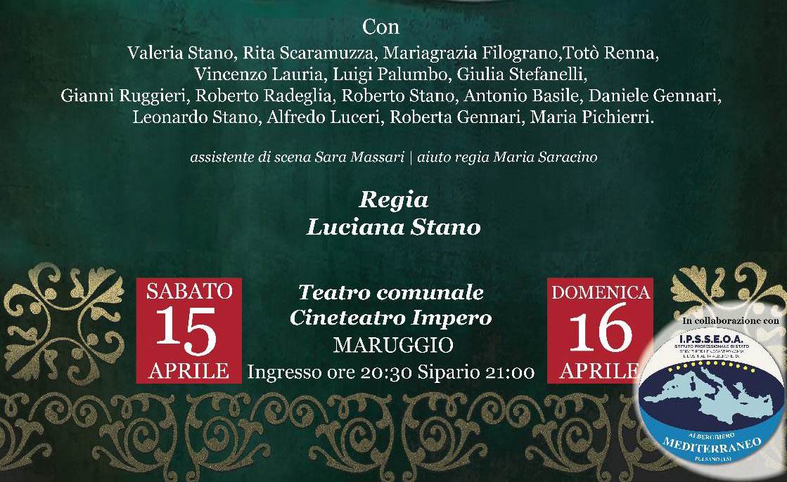Reciteranno Valeria Stano, Rita Scaramuzza, Mariagrazia Filograno, Totò Renna, Vincenzo Lauria, Luigi Palumbo, Giulia Stefanelli, Gianni Ruggieri, Roberto Radeglia, Roberto Stano, Antonio Basile, Daniele Gennari, Leonardo Stano, Alfredo Luceri, Roberta Gennari e Maria Pichierri.