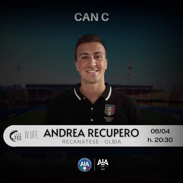 Ieri sera l’arbitro Andrea Recupero (AIA Lecce) è stato il quarto ufficiale della partita di serie C fra Recanatese e Olbia.