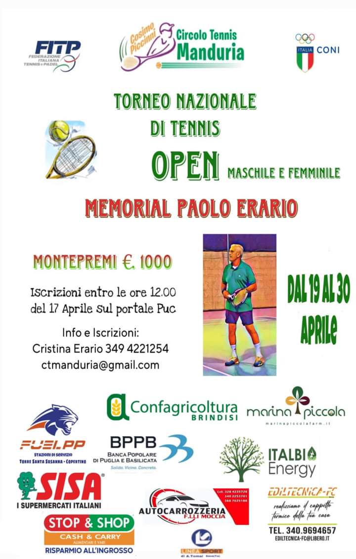 Un torneo nazionale di tennis open, aperto sia agli uomini che alle donne, intitolato a Paolo Erario, tennista manduriano scomparso pochi mesi fa.