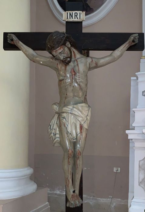 GESÙ ALLA CROCE — In cartapesta dipinta, è di autore ignoto, la croce misura cm. 270x155 ed è collocata lungo la navata sinistra della chiesa Matrice. Il Cristo, posto su una semplice croce lignea recante in alto il cartiglio con la scritta ‘INRI’, è cinto da un ‘perizonium’ di colore bianco, avvolto sui fianchi. La testa, coronata di spine, è reclinata sulla spalla destra. Il corpo presenta ferite alle braccia, al costato e alle ginocchia. Le mani e i piedi sono trafitti da chiodi.