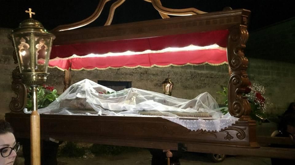 (…) Tutti gli onori erano resi al Cristo morto, deposto in cima ad un cataletto che aveva quattro fiaccole agli angoli ed i lacci con i pomoli che erano tenuti, come ai funerali di riguardo, da quattro autorità, le più alte del paese.