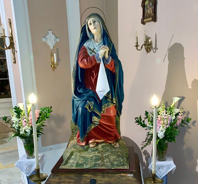 ADDOLORATA — In cartapesta dipinta, datata fine XIX inizio XX secolo, misura cm. 157x78x72. L’autore è ignoto, anche se alcuni elementi plastico-compositivi fanno ritenere presente la mano di G. Manzo; è stata oggetto di restauro nel 1989. All’interno della chiesa matrice è collocata sull’altare maggiore, nella seconda nicchia a destra. La scultura raffigura l’Addolorata in ginocchio su di una pietra, con le mani giunte in atteggiamento di preghiera e il petto trafitto da uno stiletto; il suo abbigliamento segue l’iconografia tradizionale: velo bianco, mantello blu e tunica rossa, stretta in vita da una cintura dorata.