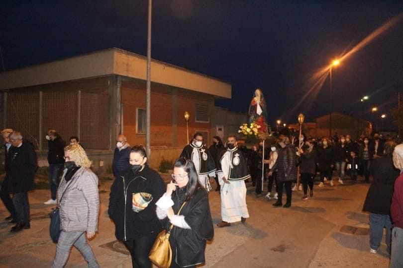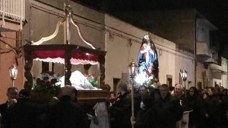 Vi era silenzio da fare udire i passi sulla strada, se non batteva la ‘trenula’, se non suonava la banda. Le voci della gente erano sommesse in quel momento di dolore. Quasi urla della Vergine, vestita di nero con abiti antichi di stoffa preziosa, erano le note alte della tromba. A quelle rispondevano, come gemiti della natura, il tamburo ed i piatti di bronzo, che penetravano e squarciavano il silenzio (…). Si assaporava il lutto che, quando è solo umano, fa essere loquaci per essere poi liberi, come cicatrici dalle croste, crisalidi dal bozzolo».