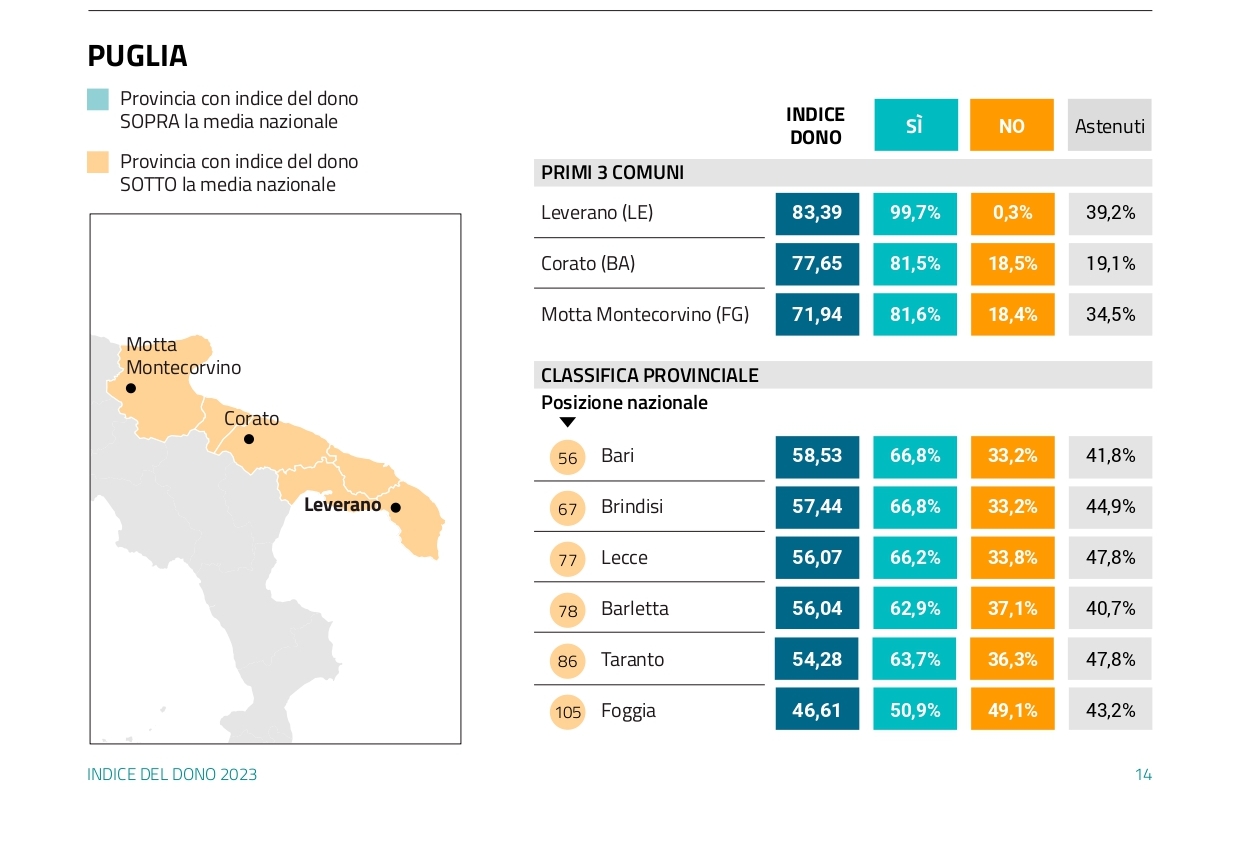 Bari è la migliore tra le province pugliesi nel complesso, 56° su 107 a livello nazionale, mentre Brindisi è 67°, Lecce 77°, Barletta-Andria-Trani 78°, Taranto 86°, Foggia 105°. La Puglia è 16° tra le regioni italiane (come nel 2021), con un indice del dono di 55,63/100 (consensi alla donazione: 63,8%), sotto la media nazionale che nel 2022 si è attestata a quota 58,64/100 (consensi 68,2%).