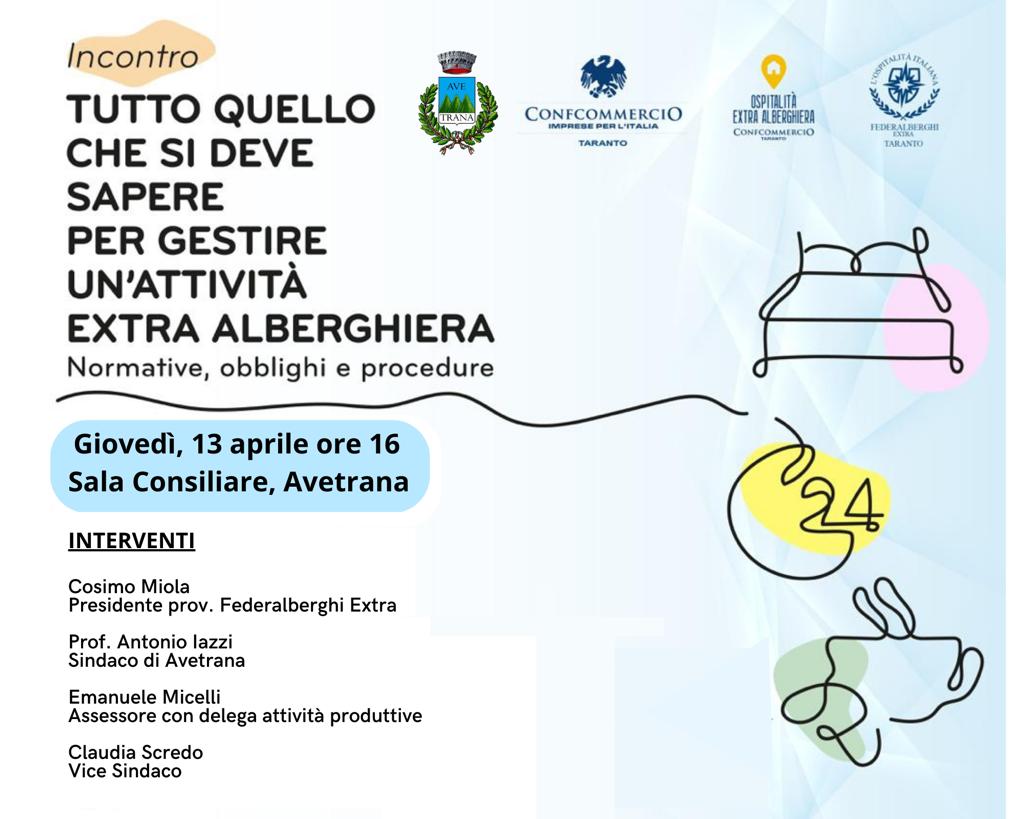 Si svolgerà giovedì 13 aprile, alle ore 16, presso la sala consiliare del Comune di Avetrana l’incontro informativo rivolto soprattutto alle attività extra alberghiere del territorio.