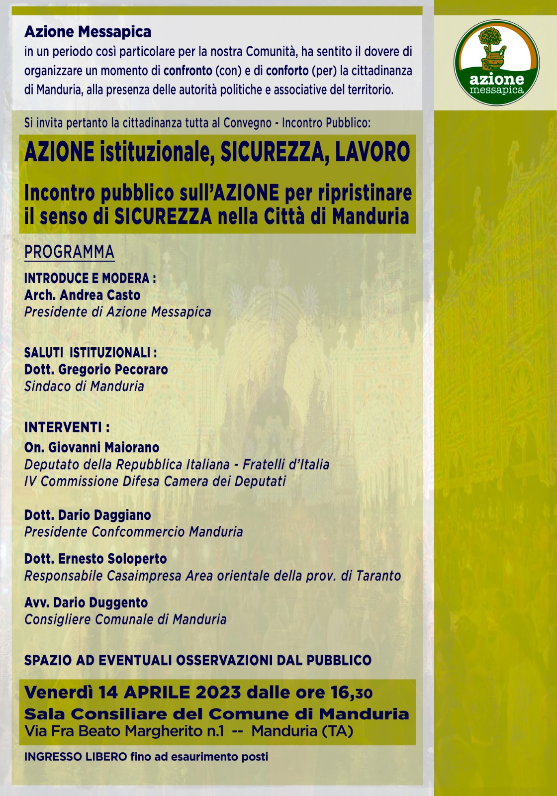 All’evento, che ha come obiettivo quello di accendere i riflettori sulla questione sicurezza e sul ripristino del senso di legalità, prenderanno parte il presidente di Azione Messapica, Andrea Casto, il sindaco di Manduria, Gregorio Pecoraro, l’onorevole Giovanni Maiorano, membro della IV Commissione Difesa della Camera dei Deputati e vicecoordinatore provinciale di Fratelli d’Italia, il presidente della Confcommercio di Manduria, Dario Daggiano, il responsabile di Casaimpresa dell’area orientale della provincia di Taranto, Ernesto Soloperto e, infine, il consigliere comunale di minoranza Dario Duggento.