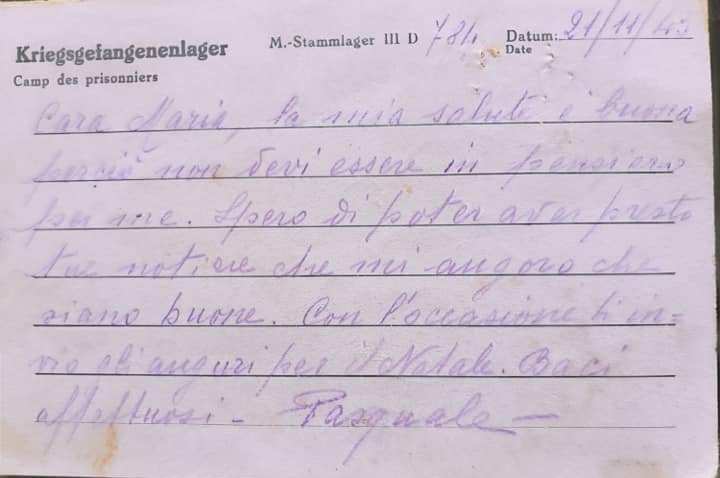 È in un campo di prigionia nei pressi di Berlino e scrive una lettera a sua moglie Maria, rassicurandola sulle sue condizioni di salute.