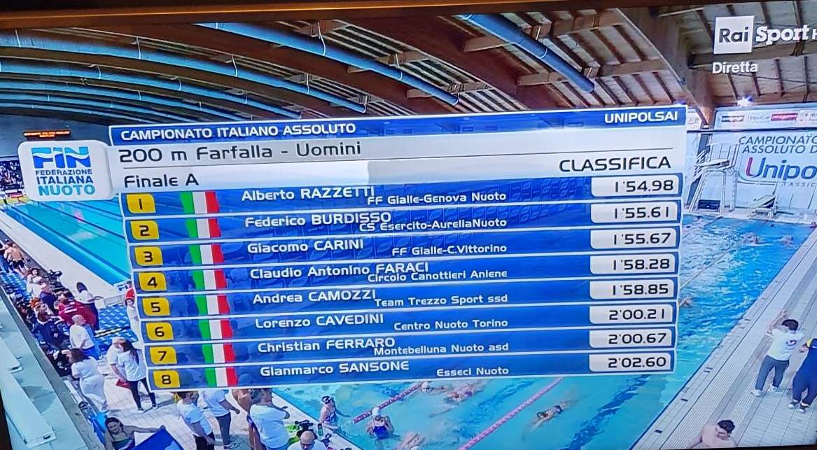 Alle spalle del tris d’oro della “farfalla” azzurra, si è sviluppata la “gara” per il quarto posto, vinta da Claudio Antonino Faraci (Circolo Canottieri Aniene), con il tempo di 1’58”28.