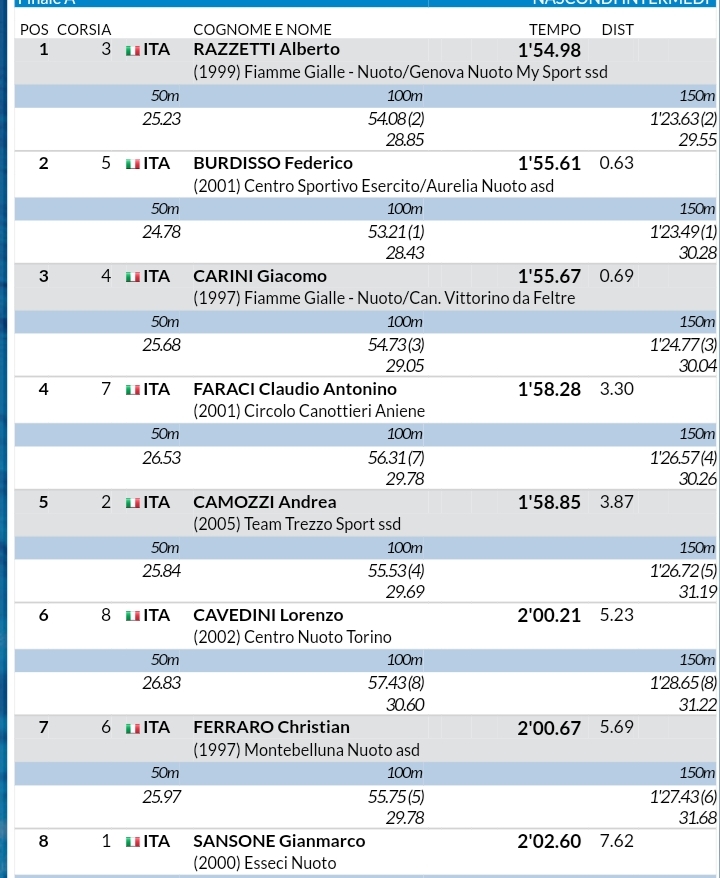 Pochi minuti fa, a Riccione (centro in cui si stanno svolgendo i campionati italiani primaverili di nuoto), Lorenzo Cavedini è sceso in piscina accanto ad alcuni big del nuoto italiano: Alberto Razzetti (Fiamme Gialle Nuoto), che si è laureato campione italiano con il tempo di 1’54”98; Federico Burdisso (Centro Sportivo Esercito), secondo con il tempo di 1’55”61; Giacomo Carini (Fiamme Gialle Nuoto), terzo con il tempo di 1’55”67.