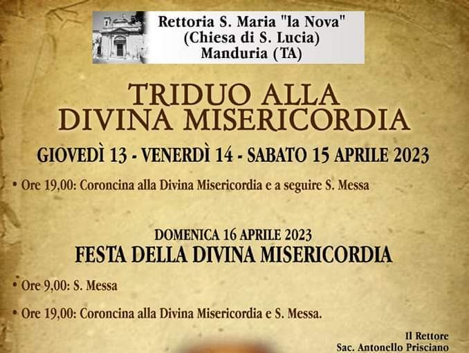 Ne dà annuncio il parroco, don Antonello Prisciano. Oggi e domani, alle 19, è prevista la Coroncina alla Divina Misericordia. Segue la S. Messa.