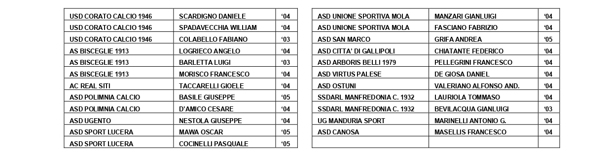 In vista della formazione della rappresentativa regionale pugliese che parteciperà al “Torneo delle Regioni”, i sotto indicati calciatori nati dal 1° gennaio 2004 in poi, sono convocati per martedì 18 aprile, alle ore 14, presso lo stadio dell’Amicizia, Centro Tecnico Federale, di Capurso, a disposizione del commissario recnico Vincenzo Tavarilli per un allenamento.
