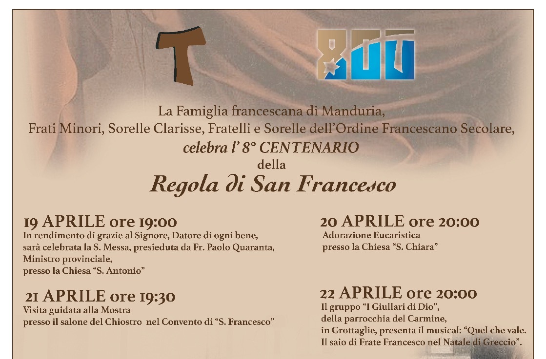 La Famiglia Francescana presente a Manduria - Frati Minori, Sorelle Clarisse, Fratelli e Sorelle dell’Ordine Francescano Secolare - celebra l’OTTAVO CENTENARIO della REGOLA DI S. FRANCESCO.