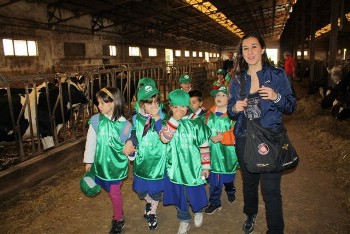 Nel corso della visita presso l’azienda zootecnica, i fratelli Stano sono stati molto disponibili; infatti hanno mostrato l’allevamento con oltre 450 capi bovini di razze diverse e hanno risposto alle numerose domande fatte dai bambini, ad esempio il perché delle targhette attaccate ad entrambe le orecchie delle mucche; è stato spiegato loro che sono i segni per distinguere un animale da un altro. Inoltre, molta curiosità hanno suscitato nei bambini i vitelli di circa una settimana di vita, che venivano allattati artificialmente dall’allevatore. Nel corso della visita diversi bambini, non essendo abituati agli odori della stalla, cercavano di tapparsi il naso. Proseguendo la visita, i bambini hanno potuto osservare i tori di differenti età che guardavano incuriositi i bambini, tutt’intorno una quantità notevole di rotoballe di paglia. In altri locali sono stati mostrati i box dove avviene la mungitura e il percorso che il latte compie prima di raggiungere i serbatoi nei quali viene conservato, in attesa di essere prelevato con i camion attrezzati per raggiungere il caseificio. La visita alla azienda si è conclusa nel magazzino dove avviene la preparazione degli alimenti con il carro miscelatore, che successivamente distribuisce la razione alimentare prodotta nella corsia della stalla. La tappa successiva è stata presso il caseificio. Ad attendere i bambini c’era il casaro di nome Albano, che ha mostrato loro la realizzazione delle mozzarelle e, con la stessa pasta, sono state create forme diverse di animaletti così come richiesto dai bambini. Molta sorpresa ha destato la velocità con la quale Albano realizzava le mozzarelle, le trecce e gli animaletti. I bambini hanno così potuto degustare all’aria aperta e in mezzo al verde le mozzarelle prodotte sotto i loro occhi. Con questa iniziativa i bambini hanno potuto conoscere tutto il percorso che il latte compie, dall’allevamento, fino alla trasformazione in mozzarelle e formaggi, passando per la mungitura.La CIA é impegnata ormai da diverso tempo nel far