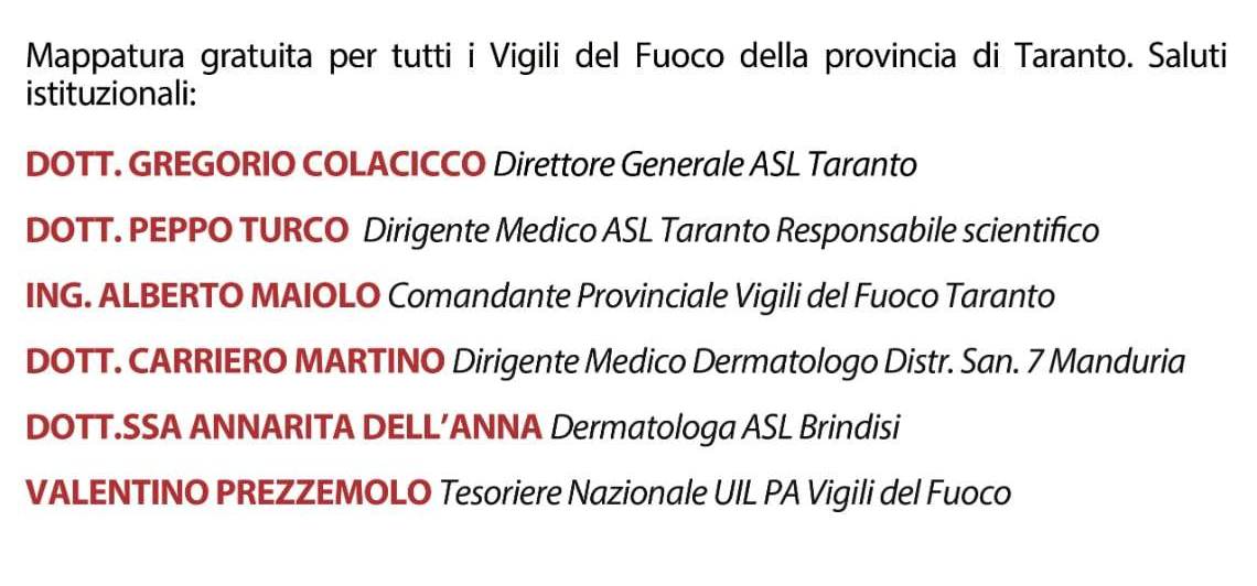 Si tratta, dunque, di una importante iniziativa, nel corso della quale interverranno il direttore generale della Asl di Taranto Gregorio Colacicco, il dirigente medico della Asl di Taranto Giuseppe Turco, il comandante provinciale dei vigili del fuoco di Taranto Alberto Maiolo, il dirigente medico dermatologo del Distretto Sanitario 7 di Manduria Martino Carriero, la dermatologa della Asl di Brindisi Annarita Dell’Anna, e il tesoriere nazionale UIL PA dei Vigili del Fuoco, Valentino Prezzemolo.
