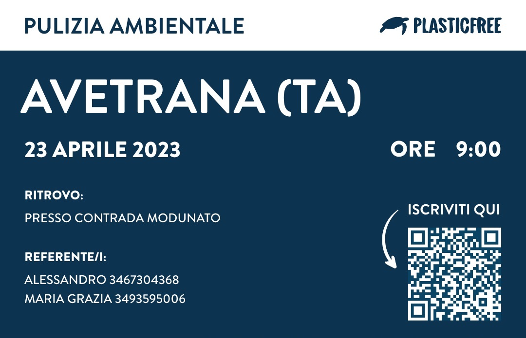 Chiunque sia interessato a partecipare dovrà iscriversi all'evento sfruttando il Qrcode della locandina oppure cliccando al seguente link: https://www.plasticfreeonlus.it/eventi/3534/23-apr-avetrana