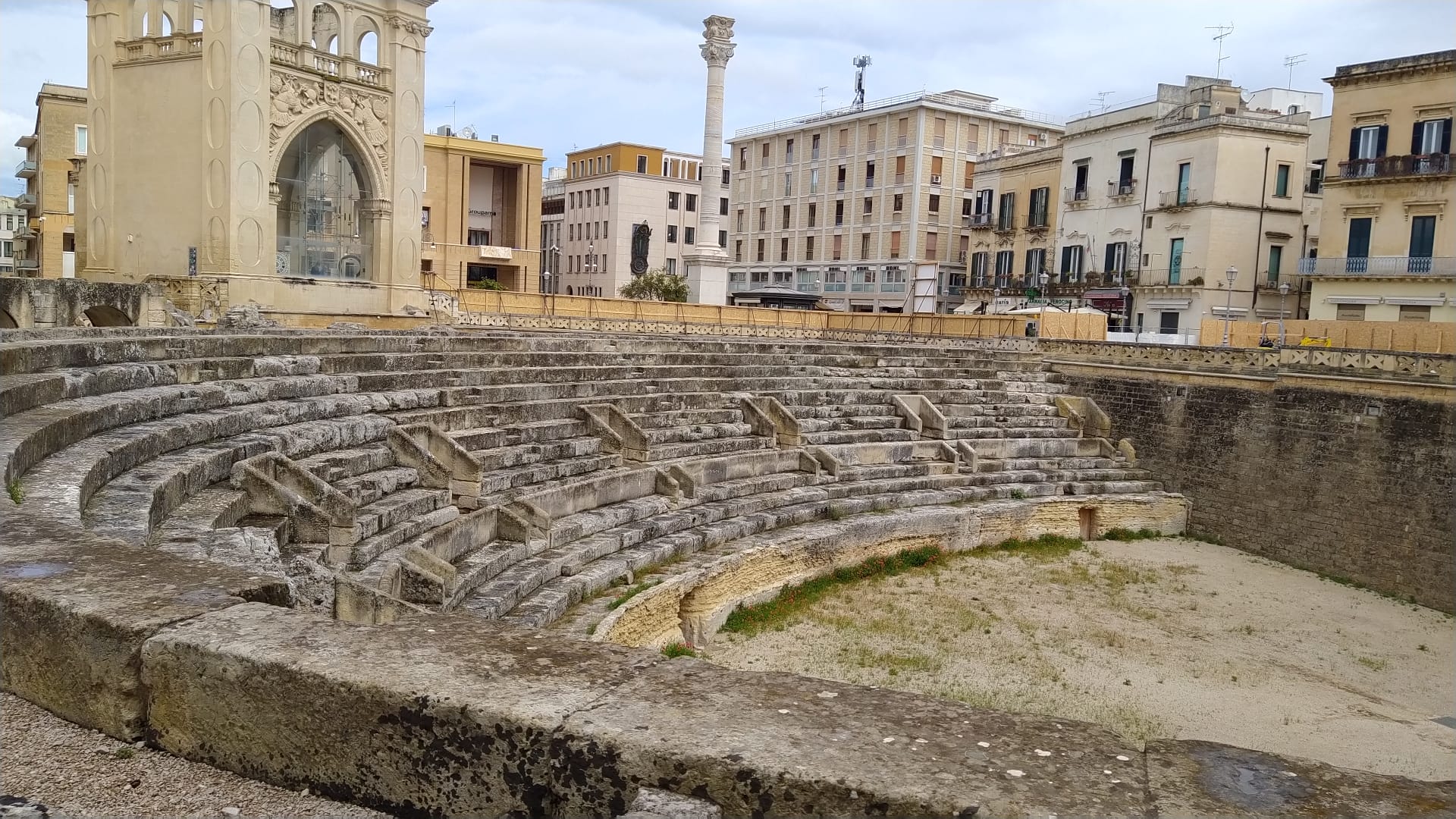 Dalla stazione al teatro romano, il passo è breve: sembra che le gradinate, al tempo di Augusto, abbiano accolto più di 5.000 spettatori. Attraverso il dedalo di viuzze, tra chiese e palazzi barocchi, in piazza Sant’Oronzo, svetta la colonna della via Appia senza la maestosa statua del patrono, con la quale attualmente è possibile un incontro davvero ravvicinato nell'androne di palazzo di Città.