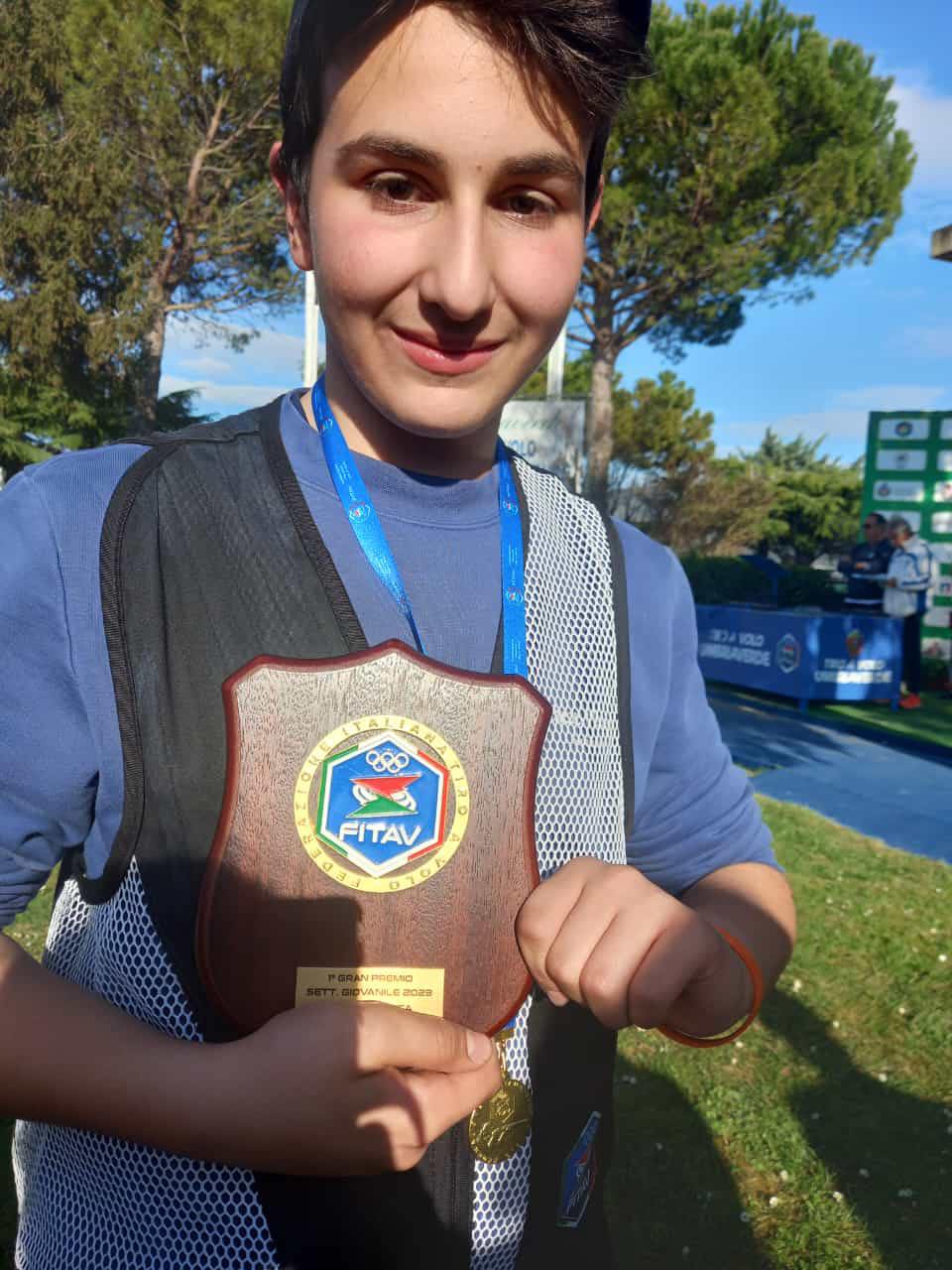 Ebbene, l’exploit è arrivato la scorsa settimana nella prima edizione del Gran Premio nazionale del settore giovanile di tiro al piattello. La gara ha queste regole: ci si cimenta in 3 serie da 25 piattelli a due colpi il sabato e in due 2 serie da 25 piattelli la domenica. Si sommano i migliori risultati delle 5 serie e i primi 6 accedono alla finale in cui si sparano 25 piattelli con un solo colpo. Gabriele si é qualificato per la finale con il terzo miglior punteggio delle 5 serie e in finale, su 25 piattelli, ne ha centrati 18 avendo a disposizione un solo colpo. Il secondo classificato, Daniele De Franco, ne ha centrati 17; il terzo, Simone Roncen, 14. Un risultato straordinario: il primo successo di prestigio in una competizione a respiro nazionale, alla quale erano iscritti ben 26 tiratori.