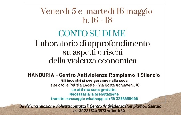 Il laboratorio, completamente gratuito, si svolgerà venerdì 5 e martedì 16 maggio dalle h. 16 alle h. 18, a Manduria, presso il Centro Antiviolenza Rompiamo il Silenzio (sito c/o la Polizia Locale - via Corte Schiavoni, 16).