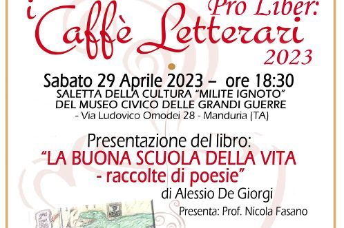 Sabato 29 aprile, alle ore 18.30, torna con un nuovo appuntamento il “Pro Liber – i caffè letterari” della Pro Loco di Manduria - la rassegna dedicata ai libri ed agli scrittori locali che raccontano il territorio o semplicemente che abbiano con esso un legame, un credito o un debito.