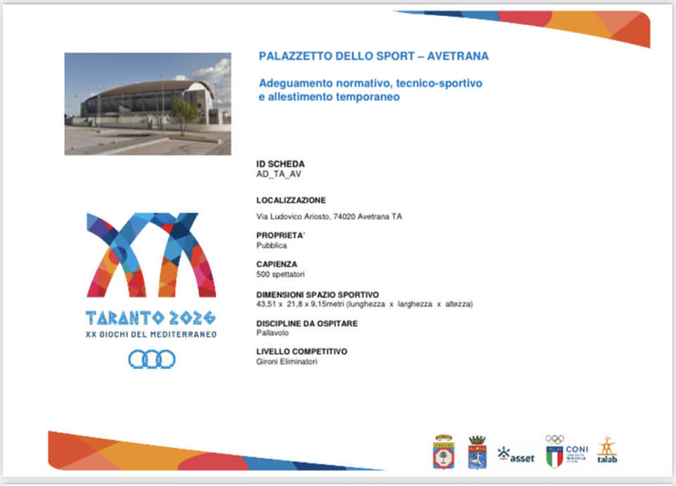 Con delibera di giunta comunale nr. 42 del 28/04/2023 abbiamo infatti approvato il progetto definitivo dell’intervento di manutenzione straordinaria, efficientamento energetico e adeguamento normativo del nostro palazzetto dello sport in ottemperanza a quanto previsto dal serrato cronoprogramma imposto dall’organizzatore dei giochi, il Comune di Taranto.