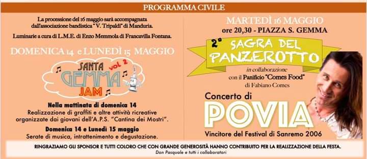 Ore 20,30: piazza S. Gemma, seconda Sagra del Panzerotto e concerto di Povia.