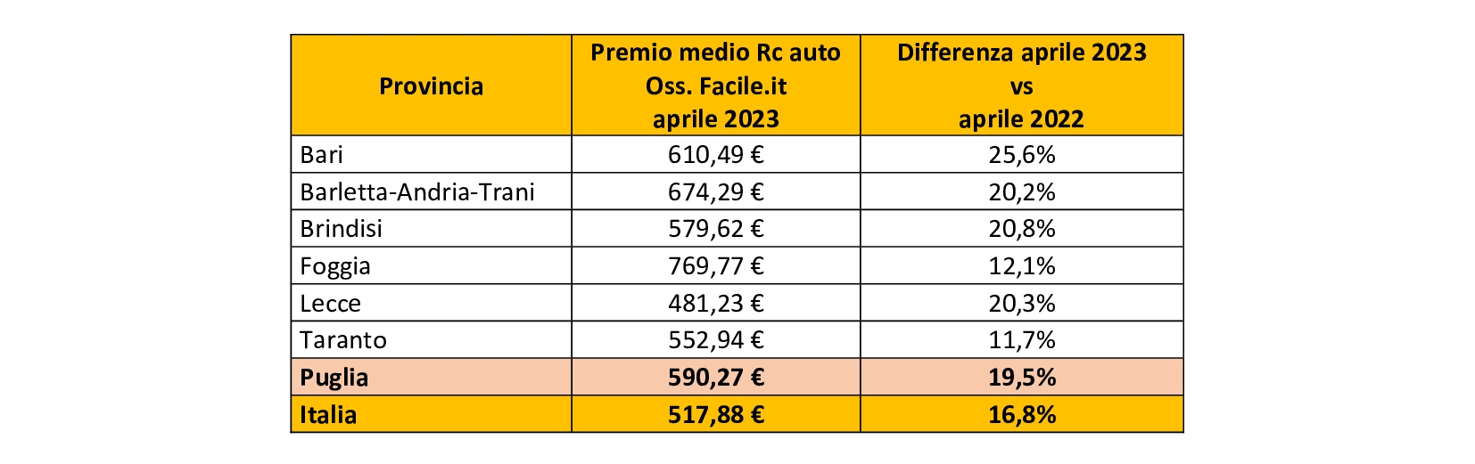 A seguire la tabella con il premio medio registrato in Puglia ad aprile 2023 e la variazione percentuale annuale.