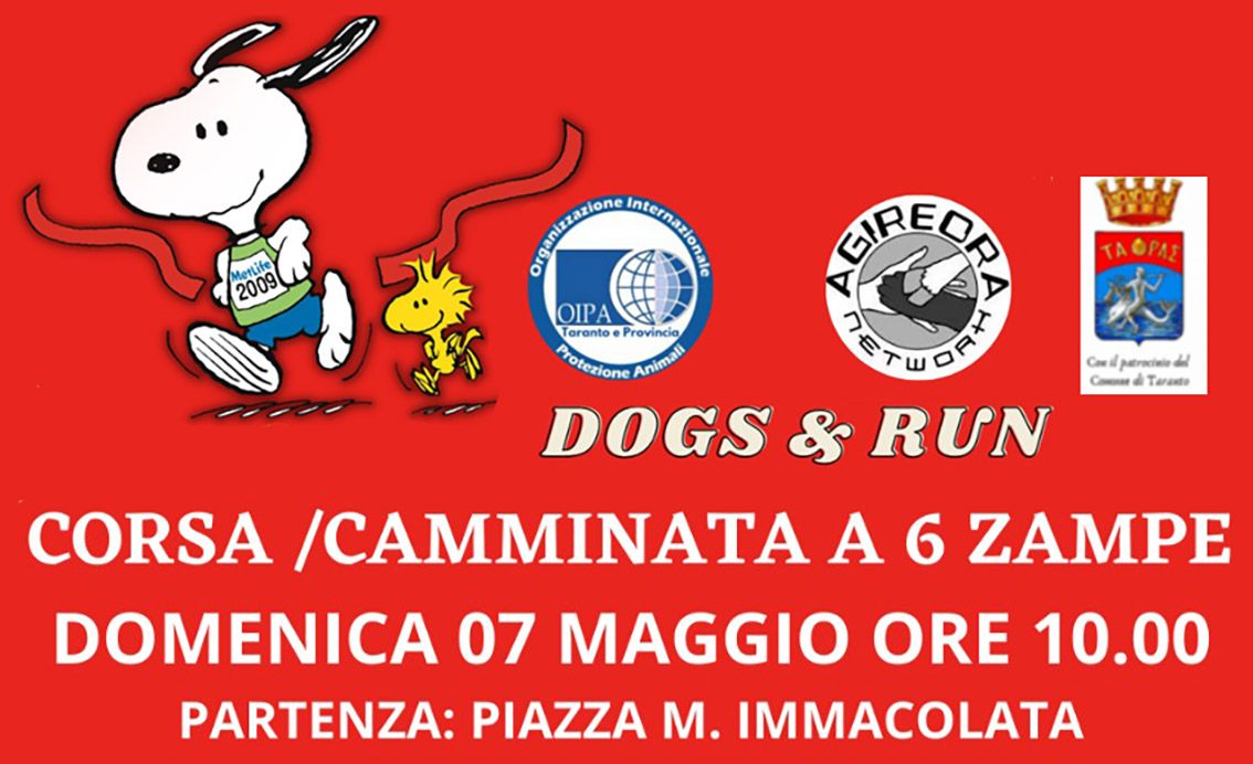 È un’iniziativa senza fini di lucro organizzata, con il patrocinio del Comune di Taranto, dalle associazioni Oipa Taranto e Agire Ora, a favore di tutti coloro che desiderano correre con il proprio cane, oppure per chi vuole semplicemente camminare in compagnia del proprio amico a quattro zampe.
