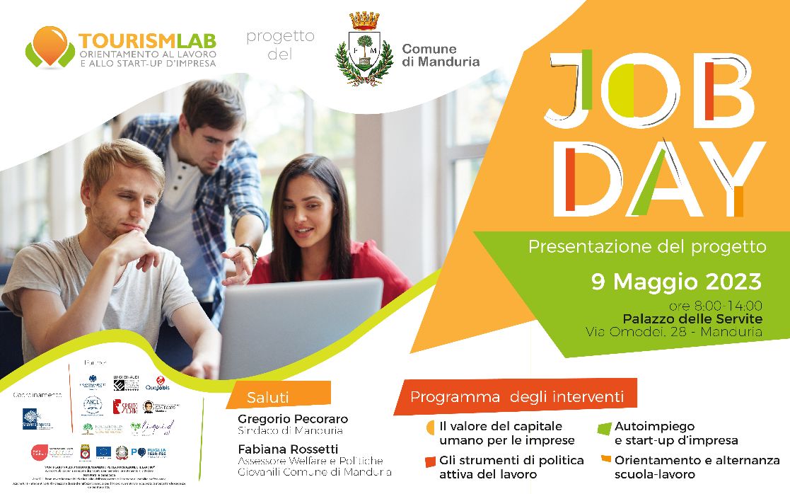 Ai nastri di partenza il Comune di Manduria con il primo Job Day di presentazione del progetto “TourismLab Orientamento al lavoro e allo start up d’impresa”, il 9 maggio prossimo dalle 8 alle 14, a palazzo delle Servite (via Omodei, 28).