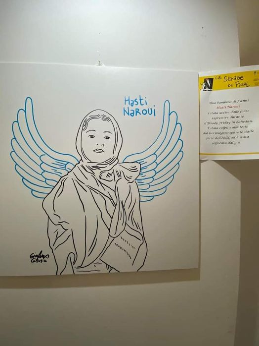 “La strage dei fiori”, con le venti illustrazioni di Gianluca Costantini dedicate ai drammi vissuti negli ultimi mesi dalle donne, dai giovani e dagli oppositori al regime teocratico iraniano, potrà essere visitata fino al prossimo 10 maggio, ingresso gratuito.