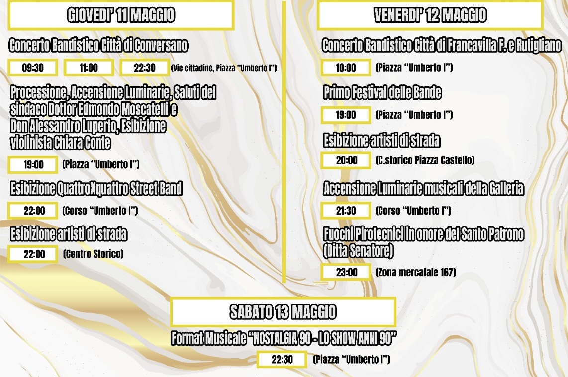 Come tradizione la processione con il simulacro del Santo di giovedì 11 maggio (ore 19) darà avvio alle festività. Partenza da piazza Umberto per via San Donaci, via Matera, attraversando via Martiri di Ungheria per poi proseguire su via Caduti di Bologna, piazza Umberto, via Mazzini, via Regina Elena, via Olmi, via Giordano, via Calvario, via Castello, via Osanna, via Taranto e quindi piazza Umberto. All’arrivo in piazza l’accensione delle luminarie ed i saluti del sindaco Edmondo Moscatelli e del parroco della chiesa Madre don Alessandro Luperto accompagnati dalla esibizione della nota violinista salentina Chiara Conte. Alle 22, sempre in piazza Umberto, la gioiosa e contagiosa esibizione della QuattroXQuattro Street Band, mentre nel centro storico si vivranno le magie e acrobazie degli artisti di strada.