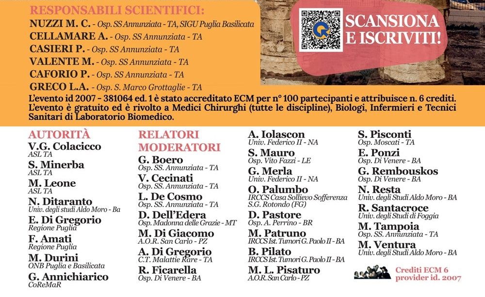 L’evento è promosso dall’equipe dell’Azienda Sanitaria Locale di Taranto formata dai genetisti Maria Cristina Nuzzi, Angelo Cellamare, Paola Casieri, Marialuisa Valente, Paola Caforio e Luigi Antonio Greco