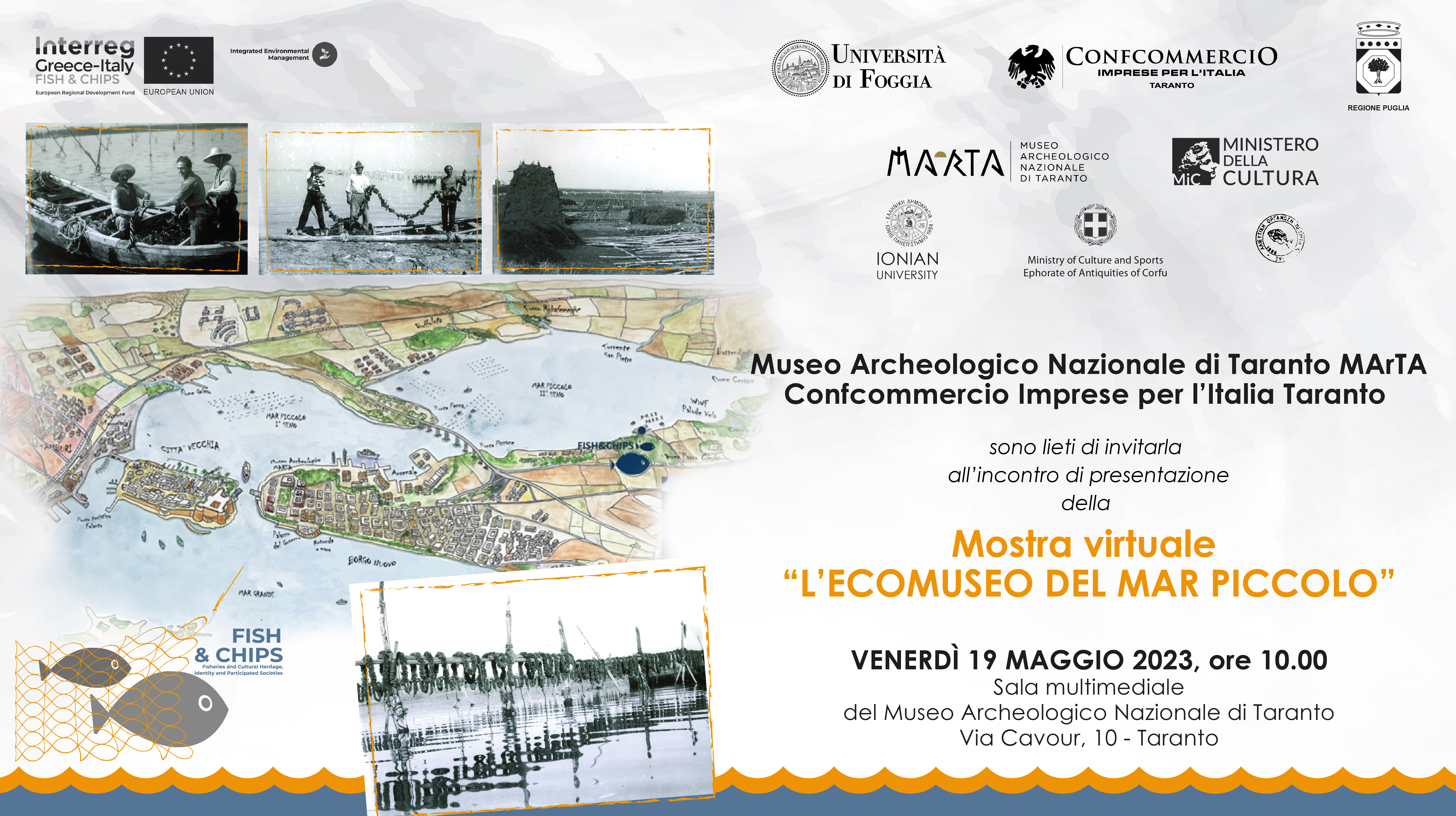 La navigazione virtuale nell’Ecomuseo del Mar Piccolo, con il suo mosaico di tradizioni, valori e cultura, legate alle attività della pesca e mitilicoltura, è il punto di approdo finale del Progetto Fish & C.H.I.P.S. (Fischeries, Cultural, Heritage, Identity and Partecipated Societies), finanziato nell’ambito del Programma Interreg V-A Greece/Italy 2014/20. Progetto ha coinvolto partner italiani e greci, tra i quali per l’Italia: l’Università di Foggia (capofila), Confcommercio Taranto, Regione Puglia ed associato il Museo Nazionale Archeologico di Taranto MArTA.